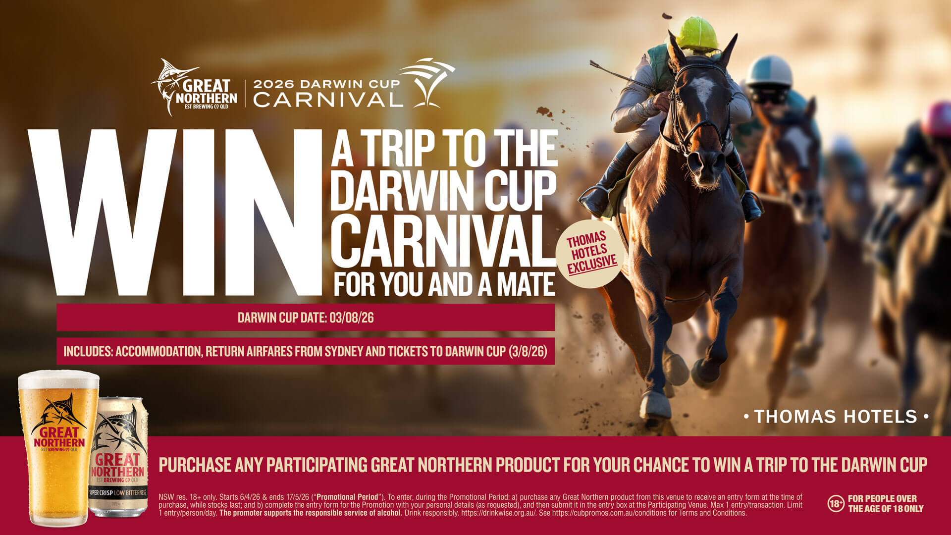 Purchase any participating Great Northern product for your chance to score a trip for two to the 2026 Darwin Cup Carnival.